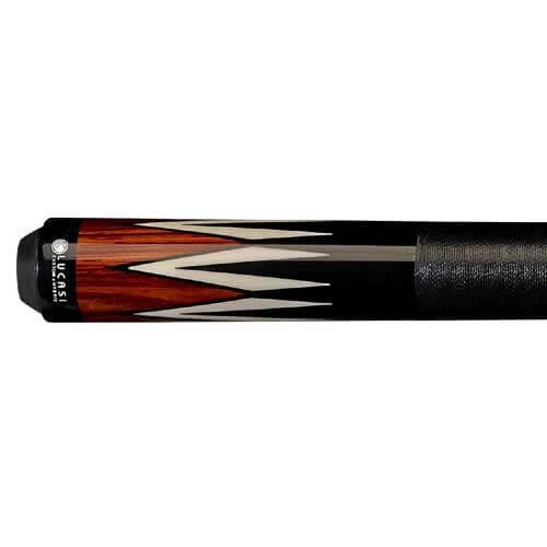 This modern classic Lucasi Custom cue features an antique-stained Super Birdseye Maple forearm and butt with six-point split black/imitation bone inlay points, split Rengas/imitation bone diamond inlays, black crowns, checked rings, black snake print embossed leather wrap, quick-release Uni-loc® joint, and Zero Flexpoint® Solid Core Low Deflection Technology Shaft.