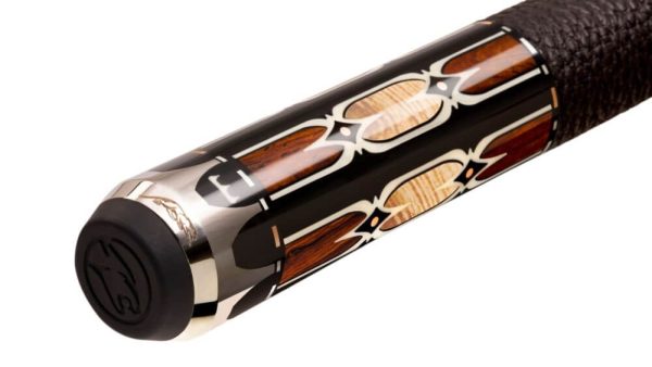 Predator Throne 2 -4 pool cue has a Gabon Ebony forearm with vibrant Cocobolo point outlined in Micarta design. At the base of each point is Curly Maple design with rose gold alloy diamond inlays, Butt sleeve has Cocobolo, Micarta, and Culry maple hourglass inlaid design. Completing cue is Uni-Loc Luxe wrap, custom dash ring work, signature Throne butt cap, and Uni-Loc weight cartridge system.